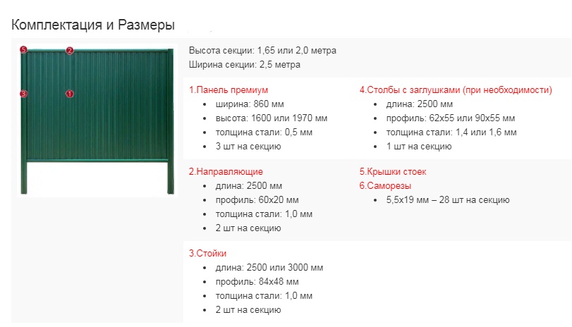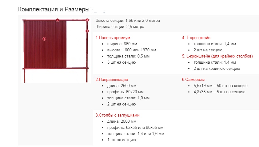 Высота секции: 1,65 или 2,0 м. Ширина секции: 2,5 м.
