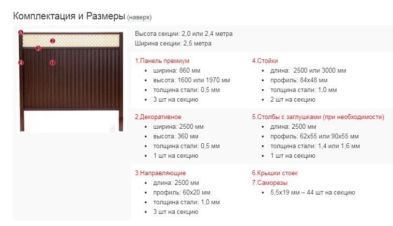 Высота секции: 2,0 или 2,4 м; Ширина секции: 2,5 м.